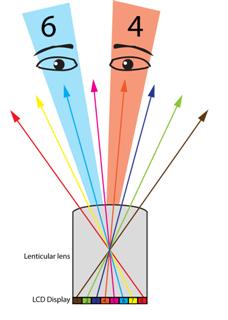 В-третьих, есть специальные дисплеи, использующие специальные лентикулярные линзы (lenticular lense), которые посылают лучи от разных пикселей в разных направлениях, поэтому каждый нечетный пиксель по горизонтали – дает картинку для левого глаза, каждый четный – для правого. ![]()